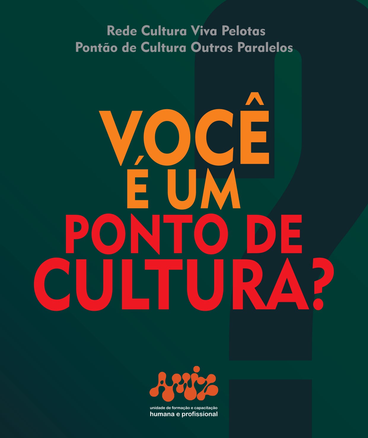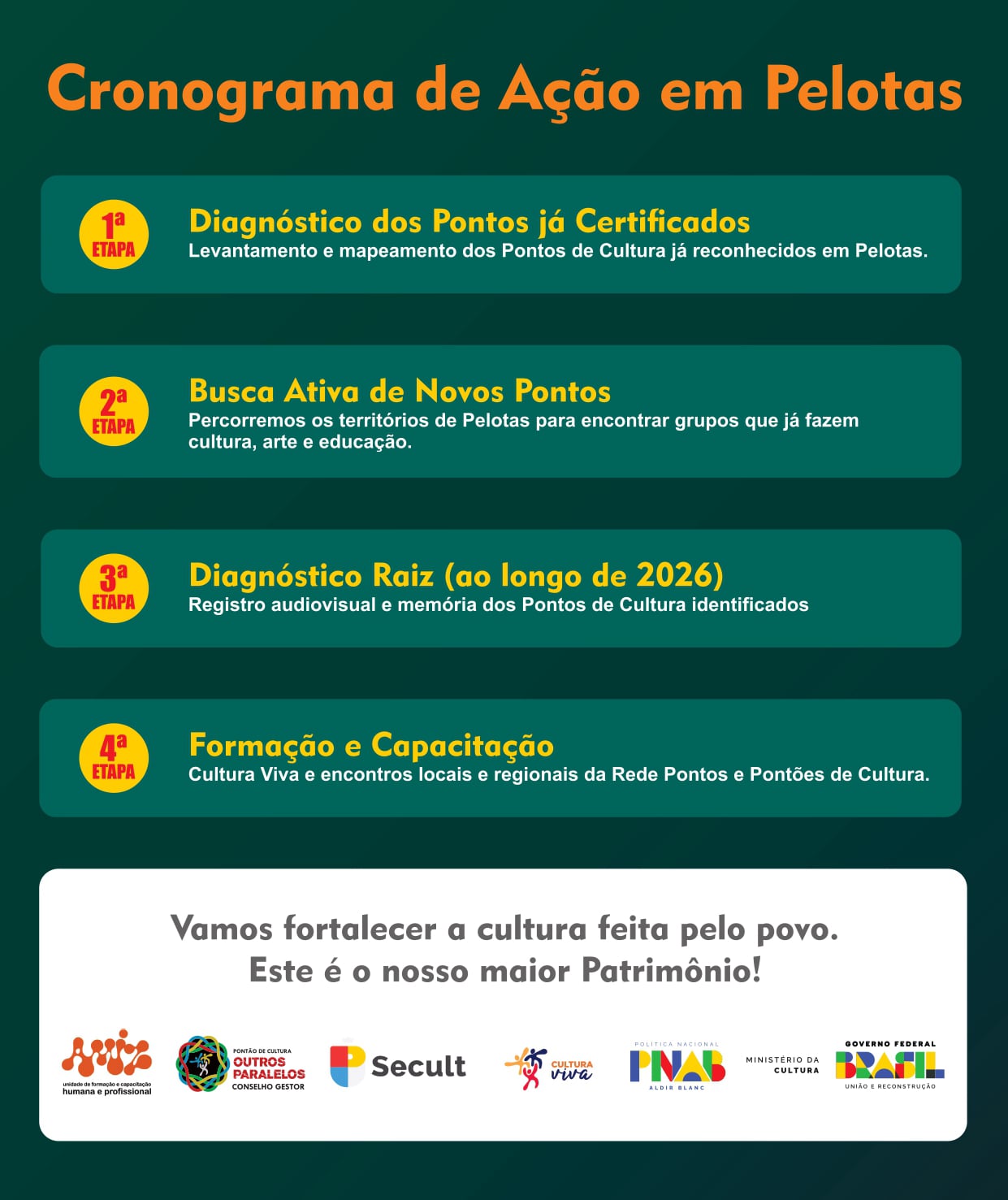 Participe! Ao fazer parte do diagnóstico, o seu grupo se conecta à Rede Local de Pelotas e abre portas para as Redes Estadual e Federal, além de acessar formações e assessorias exclusivas que o Pontão oferecerá ao longo de 2026. Queremos encontrar os pontos certificados, mas também o "Diagnóstico Raiz" — aquela cultura que pulsa há décadas em cada canto de Pelotas.